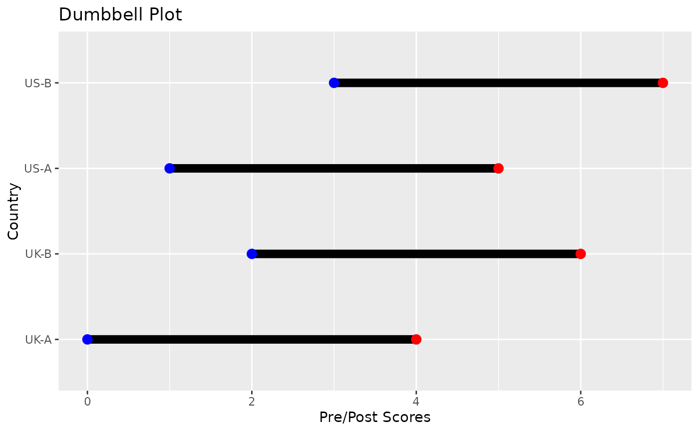 labs(title = "Dumbbell Plot", x = "Pre/Post Scores", y = "Country")