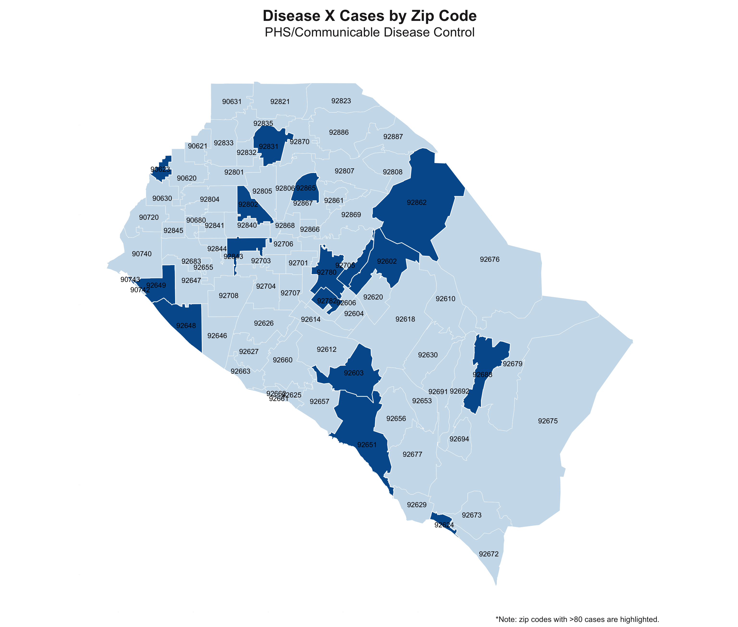 caption = "*Note: zip codes with >80 cases are highlighted."